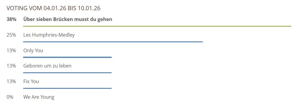 Hier können Sie über die gespielten Lieder und Chorwerke von dieser Woche abstimmen. Sie haben bei unserem neuen Voting nur noch 1 Stimme pro Teilnehmer und pro Browser zur Verfügung, also klicken Sie das Lied an, was Ihnen am besten gefallen hat und hiernach auf den Button Abstimmen!