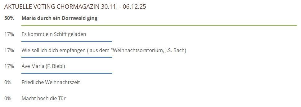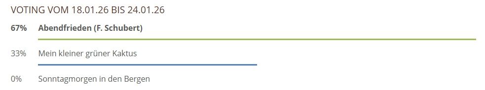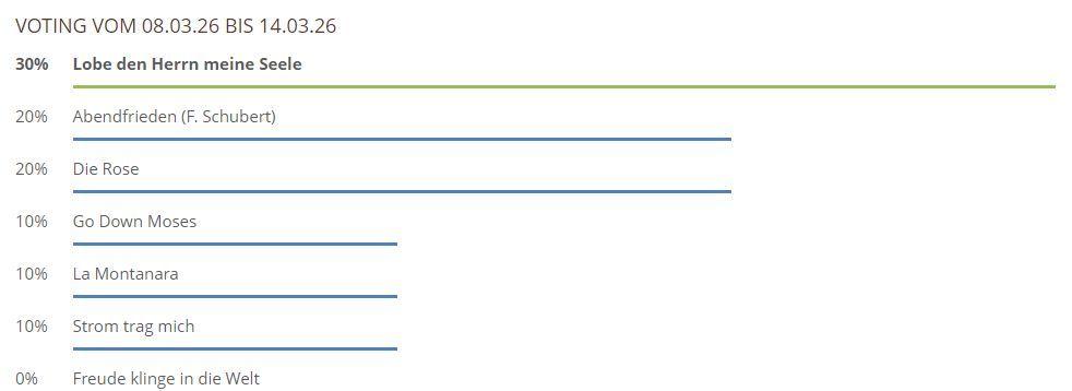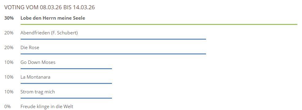 Hier können Sie über die gespielten Lieder und Chorwerke von dieser Woche abstimmen. Sie haben bei unserem neuen Voting nur noch 1 Stimme pro Teilnehmer und pro Browser zur Verfügung, also klicken Sie das Lied an, was Ihnen am besten gefallen hat und hiernach auf den Button Abstimmen!