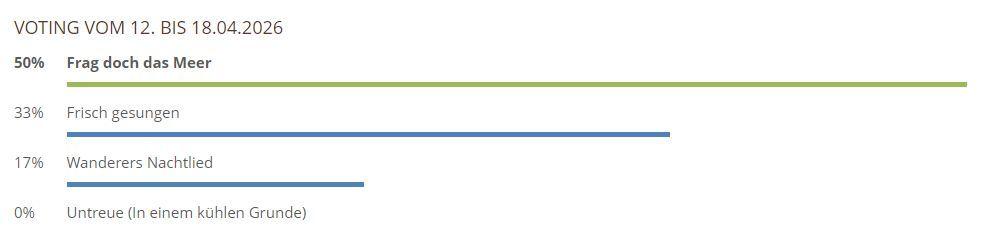 Hier können Sie über die gespielten Lieder und Chorwerke von dieser Woche abstimmen. Sie haben bei unserem neuen Voting nur noch 1 Stimme pro Teilnehmer und pro Browser zur Verfügung, also klicken Sie das Lied an, was Ihnen am besten gefallen hat und hiernach auf den Button Abstimmen!