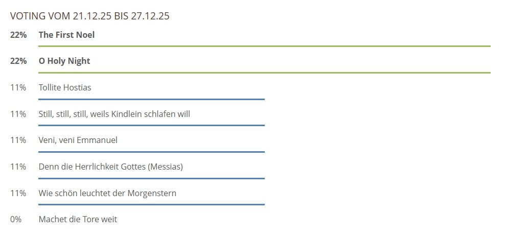 Hier können Sie über die gespielten Lieder und Chorwerke von dieser Woche abstimmen. Sie haben bei unserem neuen Voting nur noch 1 Stimme pro Teilnehmer und Browser zur Verfügung, also klicken Sie das Lied an, was Ihnen am besten gefallen hat und hiernach auf den Button Abstimmen!