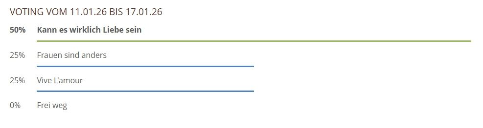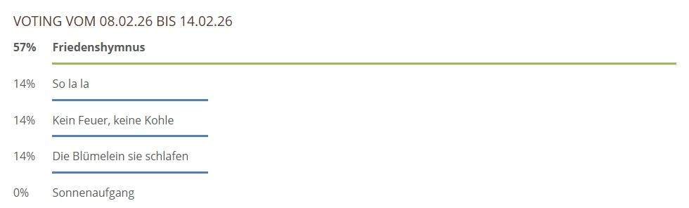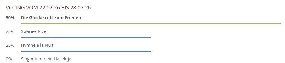 Hier können Sie über die gespielten Lieder und Chorwerke von dieser Woche abstimmen. Sie haben bei unserem neuen Voting nur noch 1 Stimme pro Teilnehmer und pro Browser zur Verfügung, also klicken Sie das Lied an, was Ihnen am besten gefallen hat und hiernach auf den Button Abstimmen!