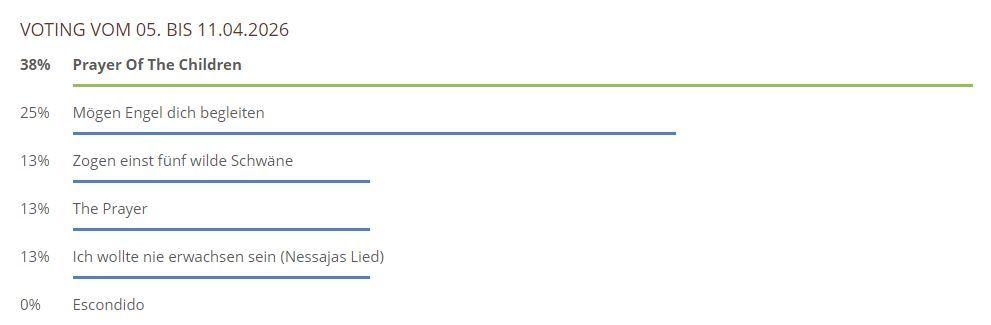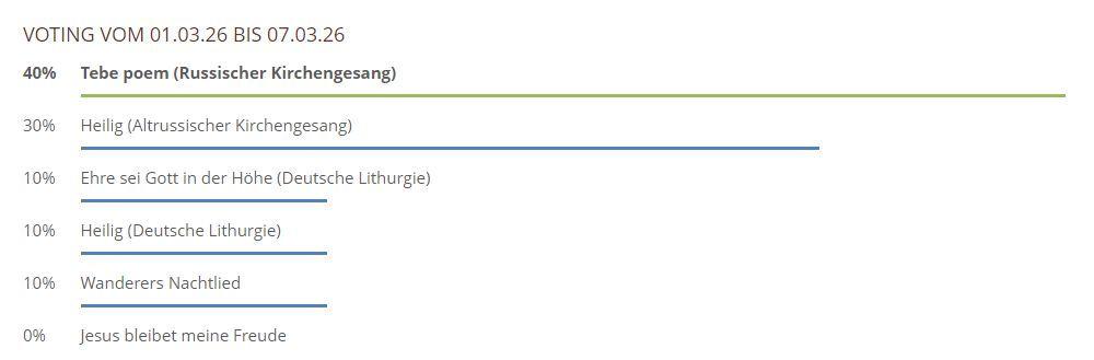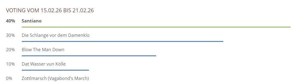 Hier können Sie über die gespielten Lieder und Chorwerke von dieser Woche abstimmen. Sie haben bei unserem neuen Voting nur noch 1 Stimme pro Teilnehmer und pro Browser zur Verfügung, also klicken Sie das Lied an, was Ihnen am besten gefallen hat und hiernach auf den Button Abstimmen!