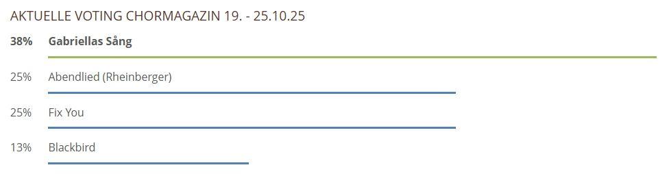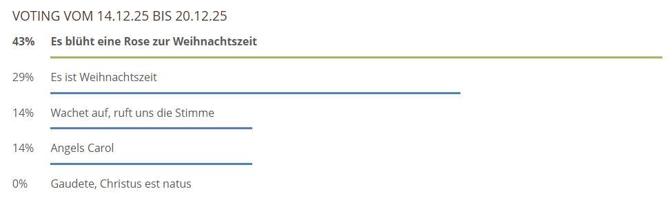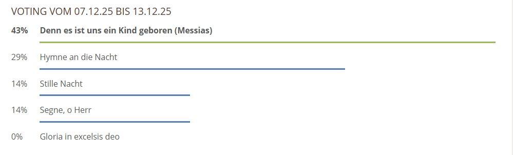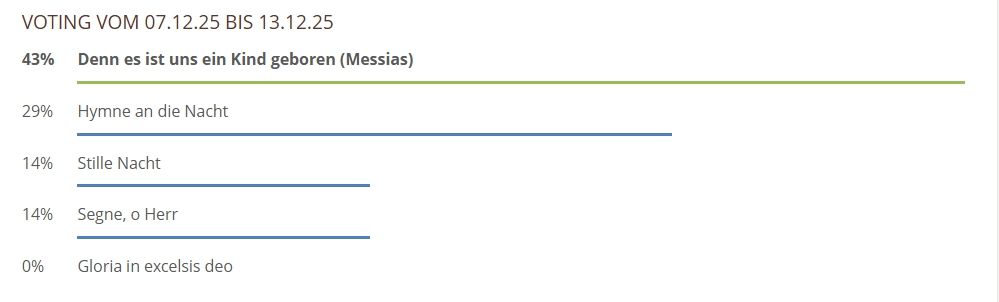 Hier können Sie über die gespielten Lieder und Chorwerke von dieser Woche abstimmen. Sie haben bei unserem neuen Voting nur noch 1 Stimme pro Teilnehmer und Browser zur Verfügung, also klicken Sie das Lied an, was Ihnen am besten gefallen hat und hiernach auf den Button Abstimmen!
